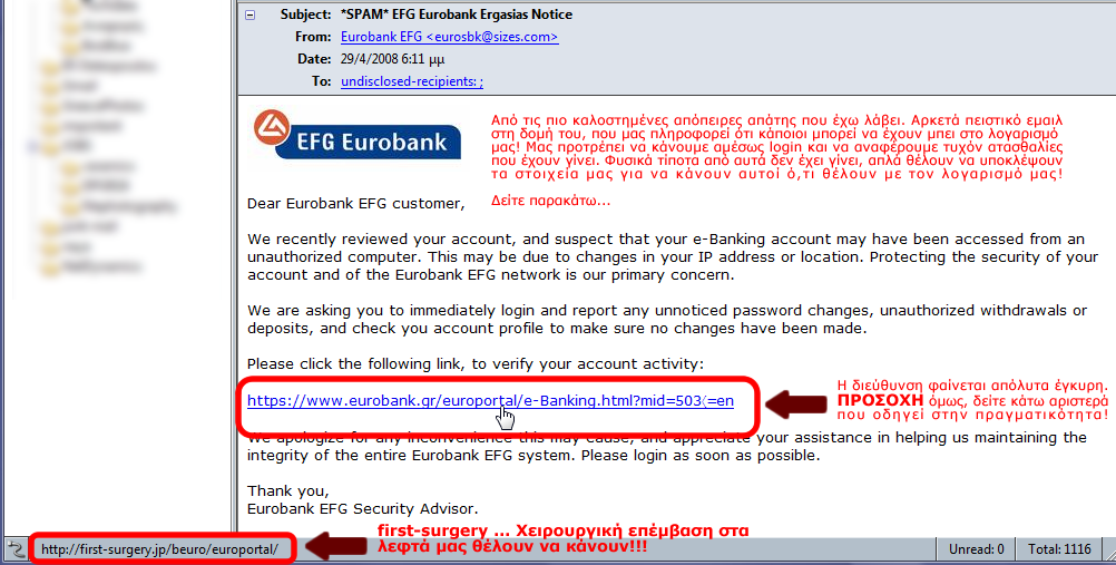 email-eurobank.pngΠοτέ μη απαντάτε σε email δίνοντας τα στοιχεία εισόδου στην τραπεζά σας, κωδικούς pin κ.τ.λ. ΠΟΤΕ και ΚΑΜΙΑ τράπεζα δεν θα σας τα ζητήσει! Συνήθως αυτά τα εμαιλ είναι εύκολο να τα καταλάβεις μιας και α)πολλές φορές σας στέλνουν για τράπεζες στις οποίες δεν έχετε λογαριασμό! β) Είναι κακομεταφρασμένα από αγγλικές απάτες (συνήθως με αυτόματους μεταφραστές). Ωστόσο δεν λείπουν και αυτά που είναι καλοστημένα και είναι εύκολο να την πατήσετε! Ορίστε (στα δεξιά) το πιο πειστικό που έχω λάβει, είναι «όλα τα λεφτά» 😀